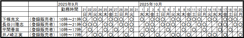 女性は薄緑色のエプロン。</strong><strong>営業時間 </strong><strong>月曜〜日曜 午前10時から午後9時まで</strong><strong>定休日</strong><strong>なし(2月、9月に設備点検のため各1日ずつ店休日)</strong><strong>営業時間以外で<br>